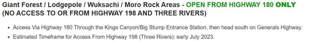 יוני 5, 2023כביש 198 בשמורת סקויה נפתח חלקית – בגישה מצפון. אפשר להגיע מצפון (מכיוון שמורת קינגס קניון וכביש 180) אל היער גנרל שרמן, אל מורו רוק ואל יעדים נוספים בצפון השמורה. הכניסה מדרום (מכיוון העיירה Three Rivers) עדיין חסומה.