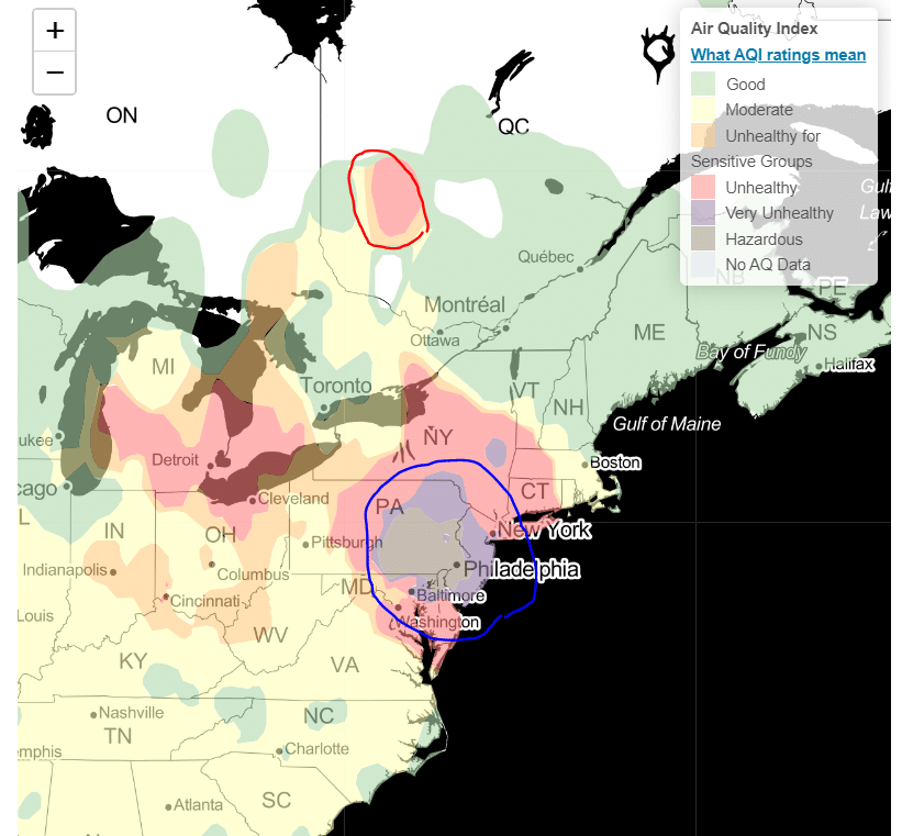 יוני 8, 2023שריפות יער בקוויבק (באזור העיגול האדום במפה) משפיעות על אזור ניו יורק ובוסטון (העיגול הכחול במפה). אין השפעה משמעותית כרגע על אזורי טיול במזרח קנדה או על אזורי טיול בצפון ניו אינגלנד (ניו המפשייר, מיין, ורמונט וכדומה וכן על טיול בצפון מדינת ניו יורק), אך כמובן שהדברים יכולים להשתנות במהירות בהתאם לכיווני הרוחות ולחצי אוויר.