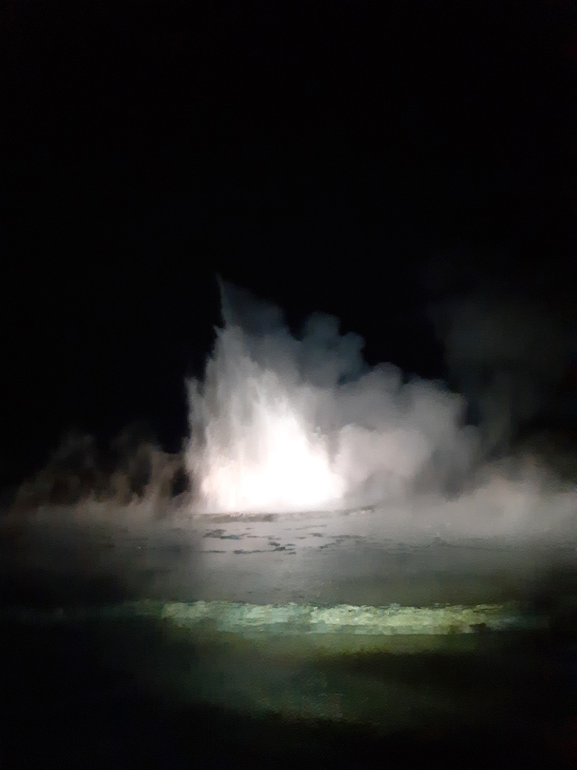 ואז זה קרה. תוך כדי לגימת מרק חם התחילה התפרצות אדירה שבלילה נראתה אדירה עוד יותר. שעה של התפרצות. מדהים (כדי לראות הארנו על הגייזר עם פנסי הרכב ועם פנסים). חזרנו לחניון עייפים אך מרוצים. מחר בבוקר אמור להתחיל לרדת שלג ואנחנו עוברים למלון…