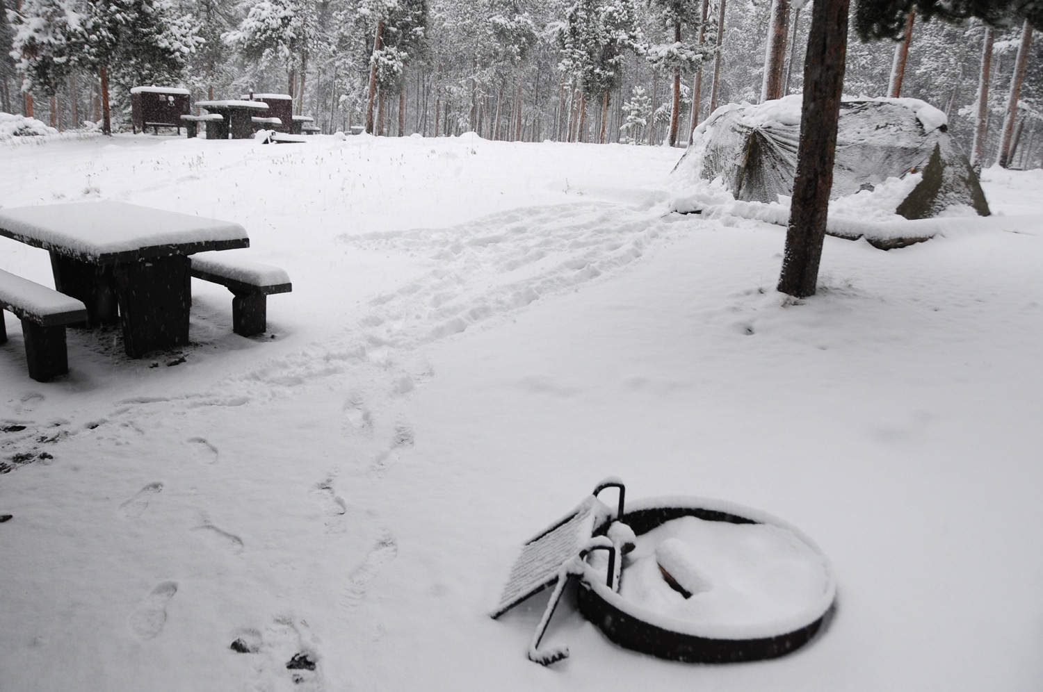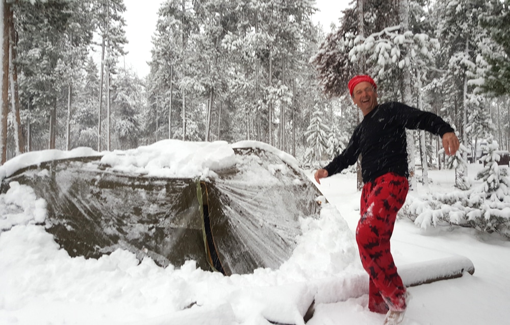 טוב זה היה בלתי צפוי… עכשיו בוקר. הלכנו לישון כאשר בחוץ היה נעים. ידענו שבבוקר יתחיל שלג (גג שני אינצ בישרו בתחזית) אבל לא שיערנו לעצמינו שנתעורר בשעה 8 בבוקר כאשר האוהל איגלו שלנו קורס עלינו ואנחנו קבורים מתחת איזה 20 ס"מ של שלג.