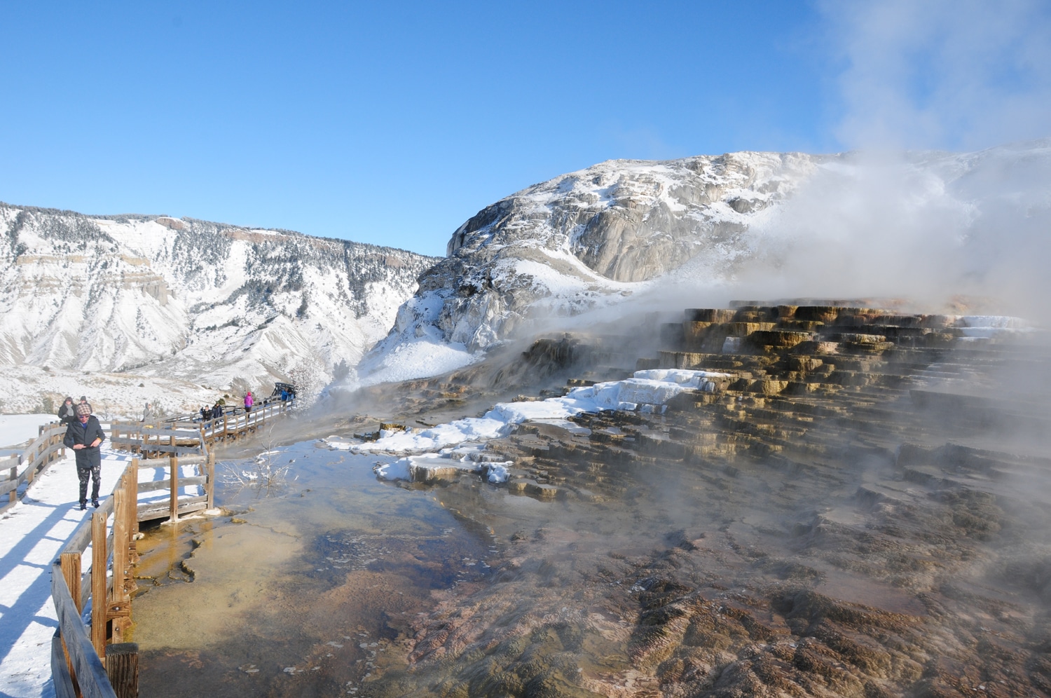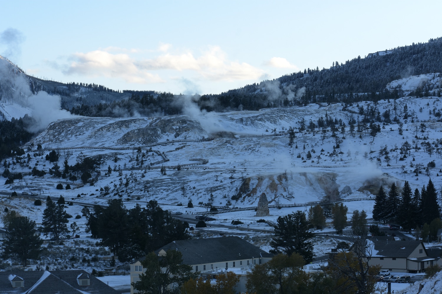 את המשך היום הקדשנו לאזור המעיינות החמים ממות'. באזור זה יש מעיינות חמים הזורמים על פני טראסות גירניות (ולא כאלה המתפרצים בגייזרים כפי שקורה בדרום השמורה). בממות' גם הוקמו מבני קבע של הצבא האמריקני בשנת 1886 שניצבים במקום עד היום. הצבא נכנס לתמונה לאחר שלמרות הכרזת השמורה בשנת 1872, קשה היה לעצור את חמיסת המשאבים הטבעיים שבה. רק עם כניסתו לאזור, וקבלת תקציב הולם הושלט החוק והסדר. בשנת 1918 הועבר ניהול השמורה לידי רשות השמורות והגנים.