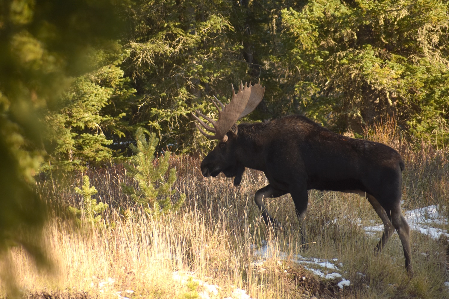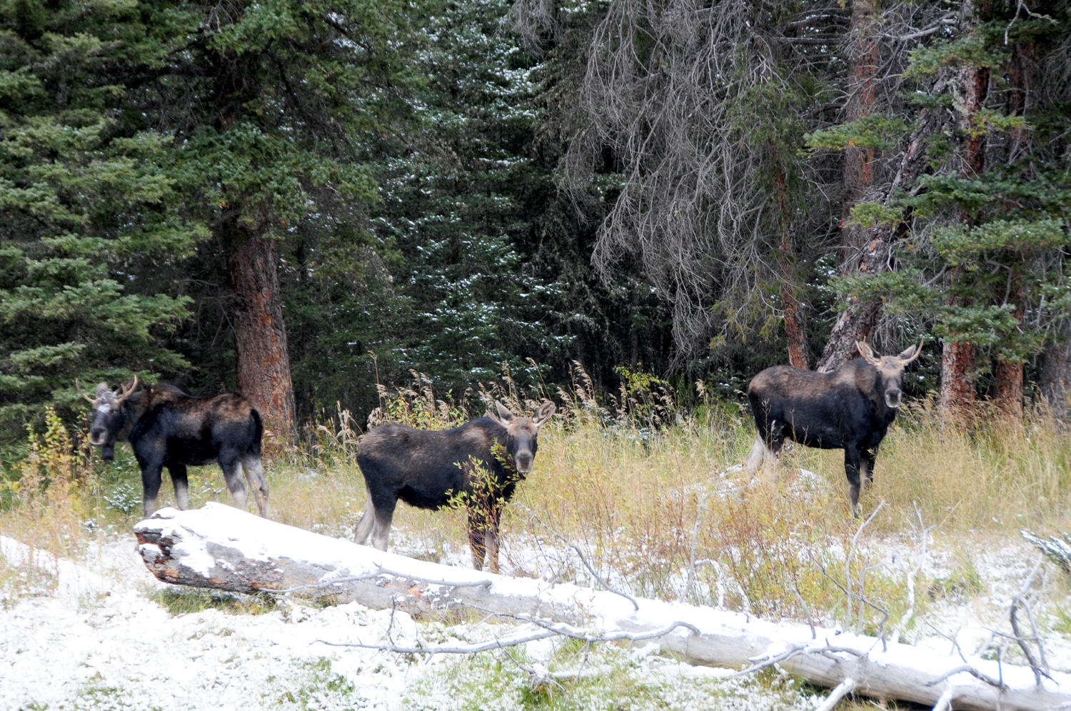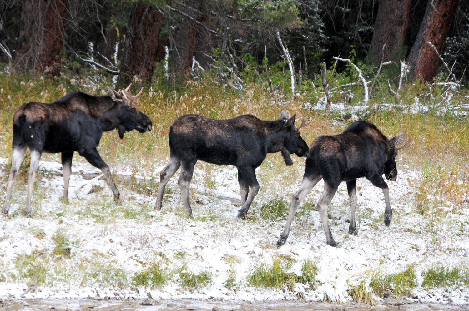 הדרך חולפת לצד נהר הג'לטין. הנהר זורם אך האגמים שסביבו קפואים. שוב יורד קצת שלג. זה בהחלט לא היה בתחזית. לפתע עומר מזהה מוס מעברו השני של הנהר. לא אחד, לא שניים. שלושה. שלושה זכרים צעירים (קרניו של המוס נושרות כל סתיו ובכל שנה הן צומחות לגודל גדול יותר על פי גיל האייל – אייל צעיר קרניים קטנות. אייל מבוגר קרניים גדולות). מצב הרוח מיד משתנה. כולנו רצים לצלם, והאיילים משתפים פעולה ![]()