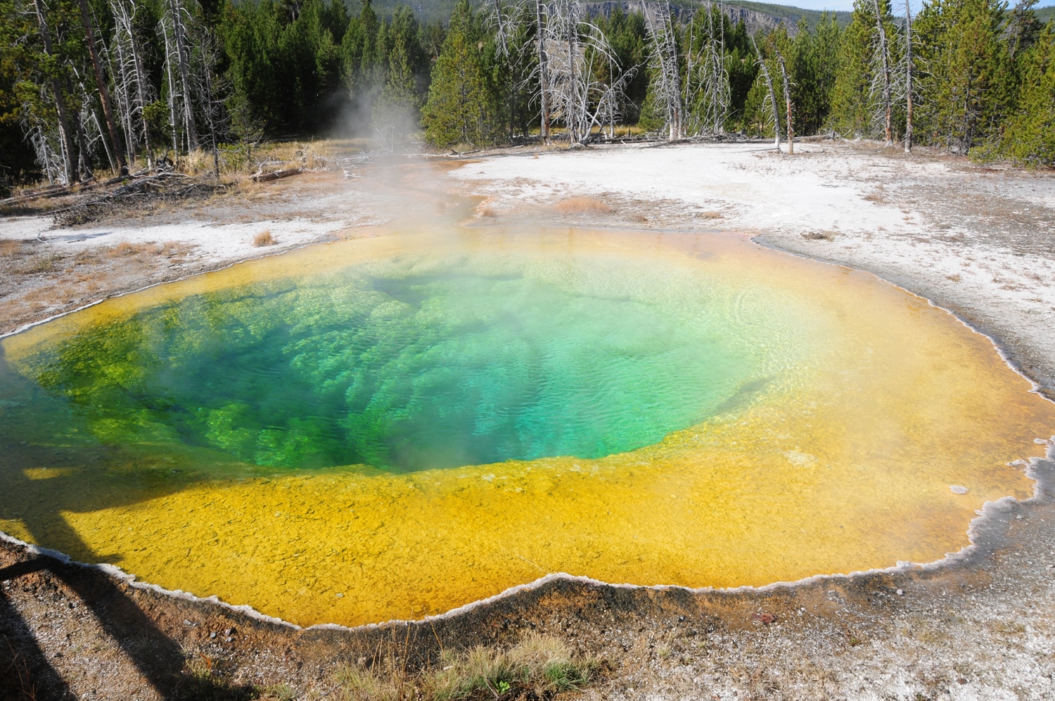 בריכת מורנינג גלורי (איזה שם יפהפה). מקור הצבעים באצות ובחיידקים שחיים במי המעיינות החמים