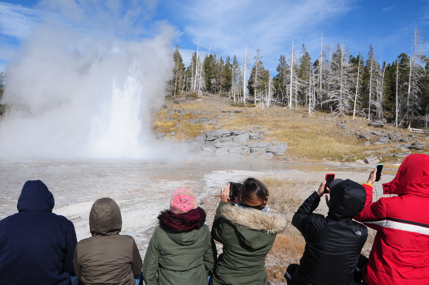 אנחנו נסענו היום מגרדינר שבצפון השמורה חזרה דרומה לאגני הגייזרים. ביקרנו באגן התחתון (שהוא הצפוני ביותר) ובעוד כמה אגנים קטנים יותר. אחרי יומיים באזורים הפחות מתויירים של השמורה, החזרה דרומה לאזורים המתויירים – עם המוני האוטובוסים המורידים מאות תיירים (המוני סינים בעיקר), יצרה קצת הרגשת אי נוחות (ובקיץ המצב הרבה יותר גרוע). מצד שני גם היופי היה רב במיוחד – בגלל הקור העז (היום התחיל בסביבות 5 מעלות פרנהייט שזה בערך מינוס 15 מעלות צלזיוס) מכל הנביעות החמות עלו אדים בכמות כזו שיצרה מראה דרמטי מאוד – כמעט מראה של שריפה. ענפי העצים בסמוך למעיינות החמים כוסו קרח – שמקורו קפיאה של אדים אלו.