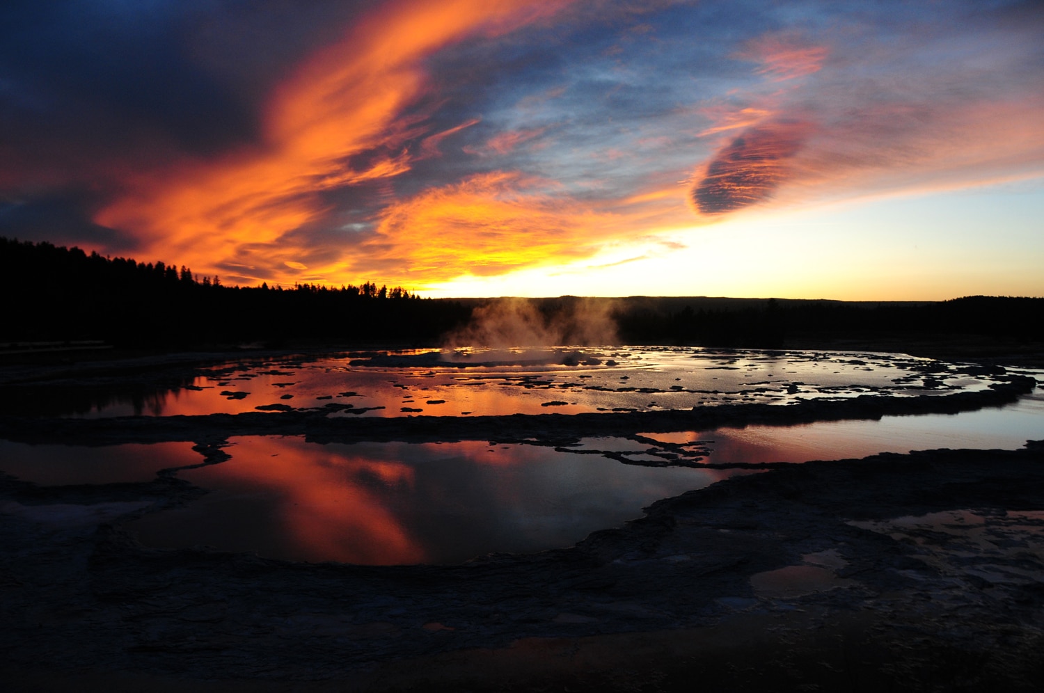 שקיעה ליד הגייזר גרייט פאונטיין שבאגן הגייזרים האמצעי