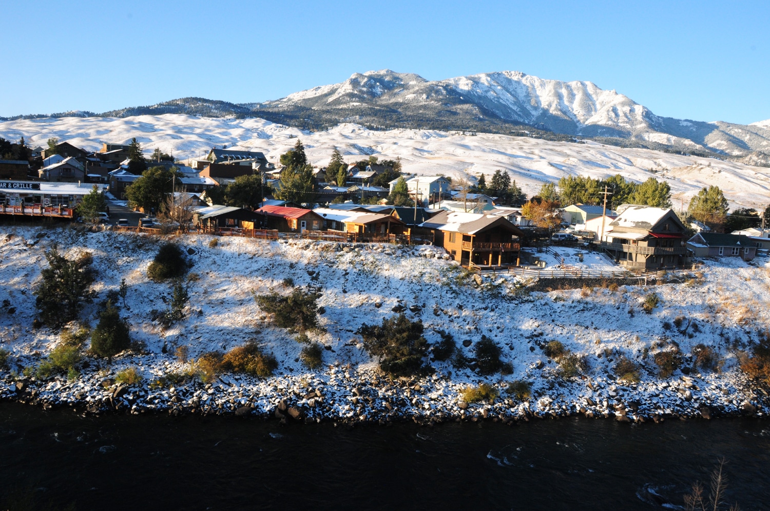 אחרי פאסט פוד בעיירה בוזמן ממשיכים לעיירה גרדנר. הדרך יפהפייה – נהר, חוות ציוריות ושלג. גם העיירה יפהפייה, והתפתחה מאוד מאז שביקרתי בה לאחרונה. בכניסה הצפונית לשמורת ילוסטון הסמוכה לעיירה נודע לנו שרוב כבישי השמורה נפתחו לפני שעה, כלומר אפשר היה לוותר על המעקף.