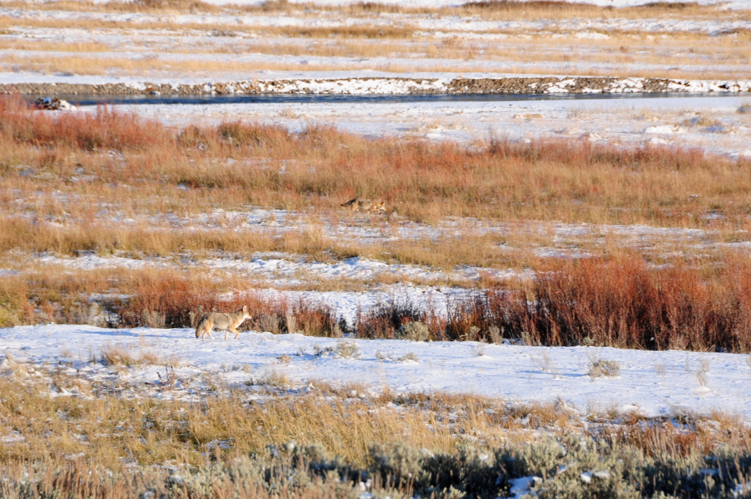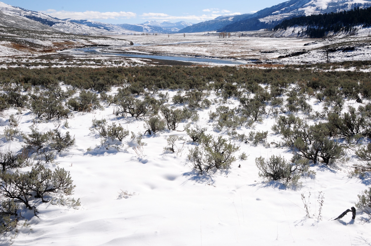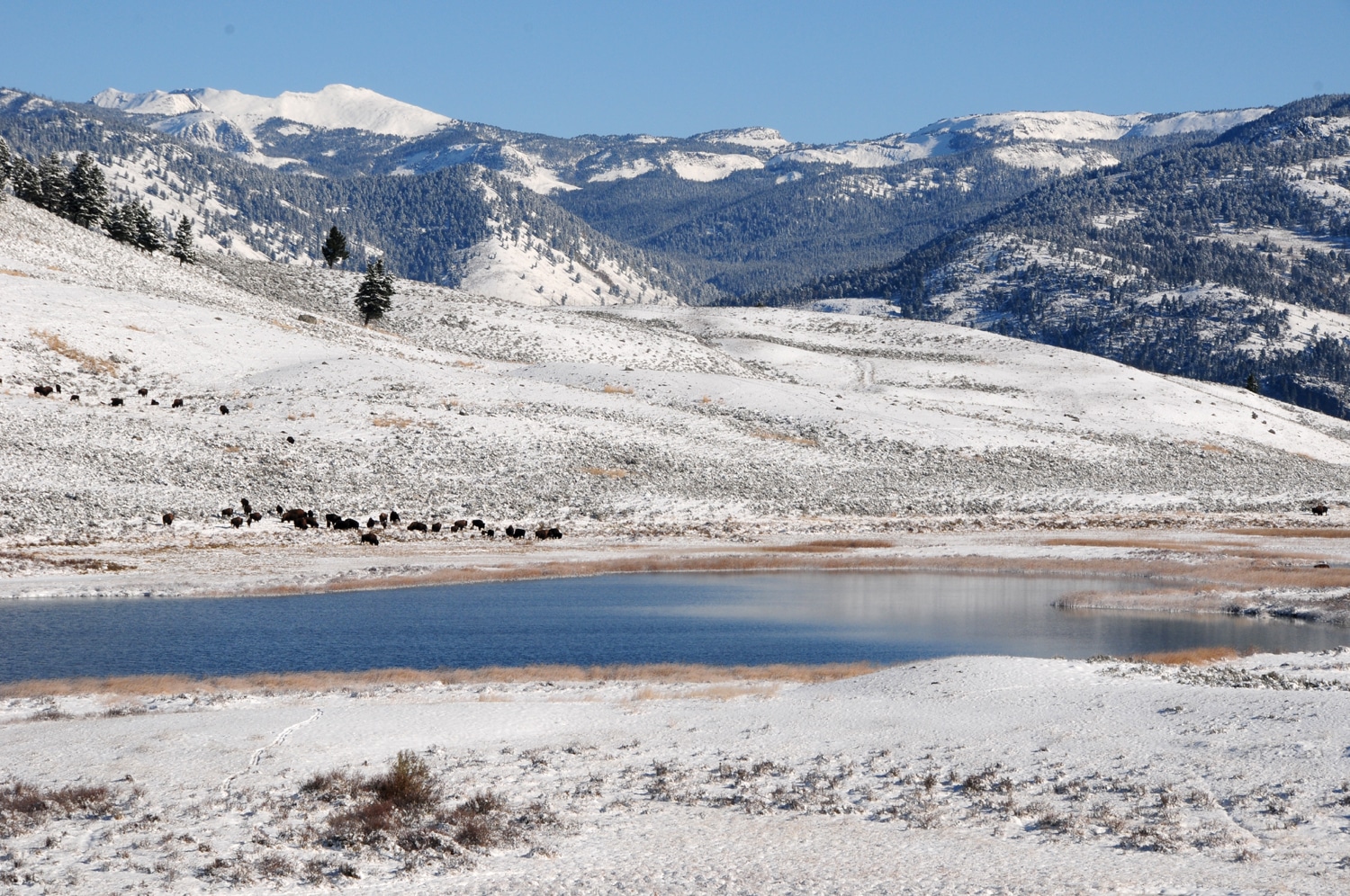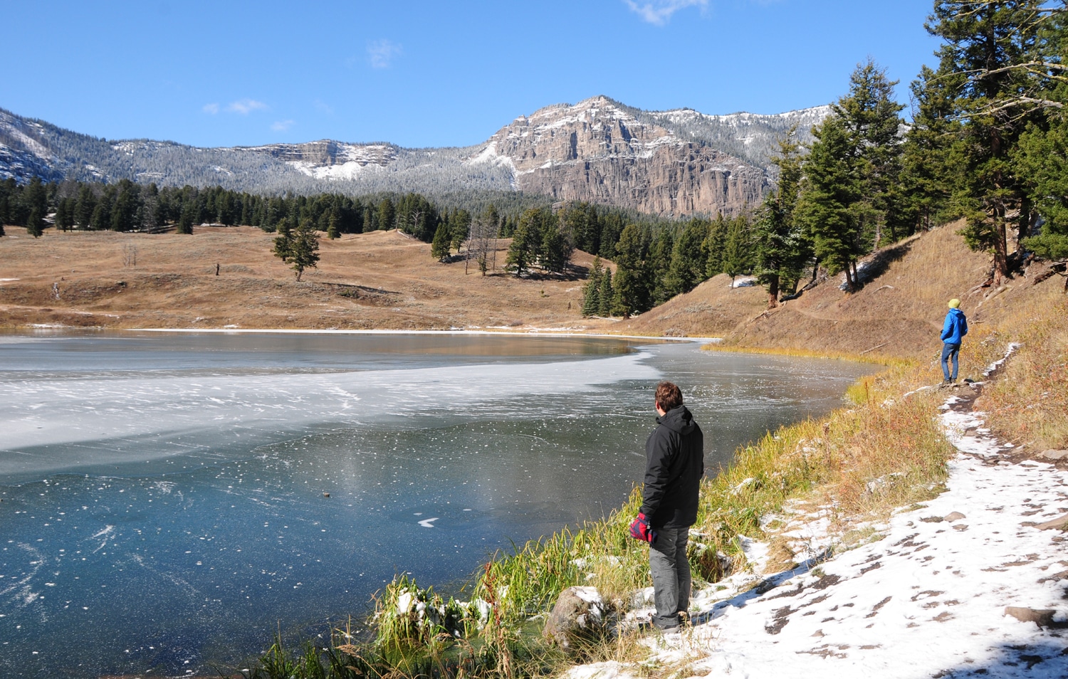 חזרה אלינו – אז מה היה לנו היום? יום קר עם שמים כחולים ואוויר צח. את היום הזה הקדשנו לעמק הלמאר (עד לעיירה קוק סיטי) המכונה בפני רבים 'הסרנגטי של ילוסטון'. רוב מה שעשינו (אחרי הרחצה במעיינות) זה לנסוע הלוך וחזור בעמק, שאורכו כמה עשרות מייל, ולחפש אחר בעלי חיים (פלוס מסלול קצר ומקסים לאגם טראוט). היום הזה לא מתאים לכל סוגי המטיילים אלא רק לאוהבי בעלי חיים מושבעים, ולכאלה שיש להם הרבה הרבה סבלנות (כדאי גם להצטייד במשקפות טובות).