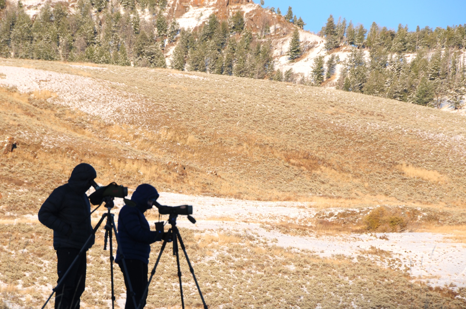 אנחנו לא הפריקים היחידים. בעמק למאר אין אוטובוסים על אוטובוסים של תיירים (בעיקר של סינים), אבל יש כאן מלא חובבי בעלי חיים עם משקפות שנראות כטלסקופים ענקיים, שמחפשים כל היום בעלי חיים. אז יש את האישה הנחמדה מהעיירה איידהו פאלס (אותה פגשנו כמה פעמים היום) שכל פעם נתנה לנו להסתכל בסקופ שלה. יש את הזוג הנחמד בוואן שכל פעם נפגשנו איתו שוב ושוב, ויש את אלה בטנדר האדום עם הסקופים הענקיים. אה, ויש גם כאלה שהם ממש מקצוענים שעוקבים אחרי המשדרים של הזאבים.