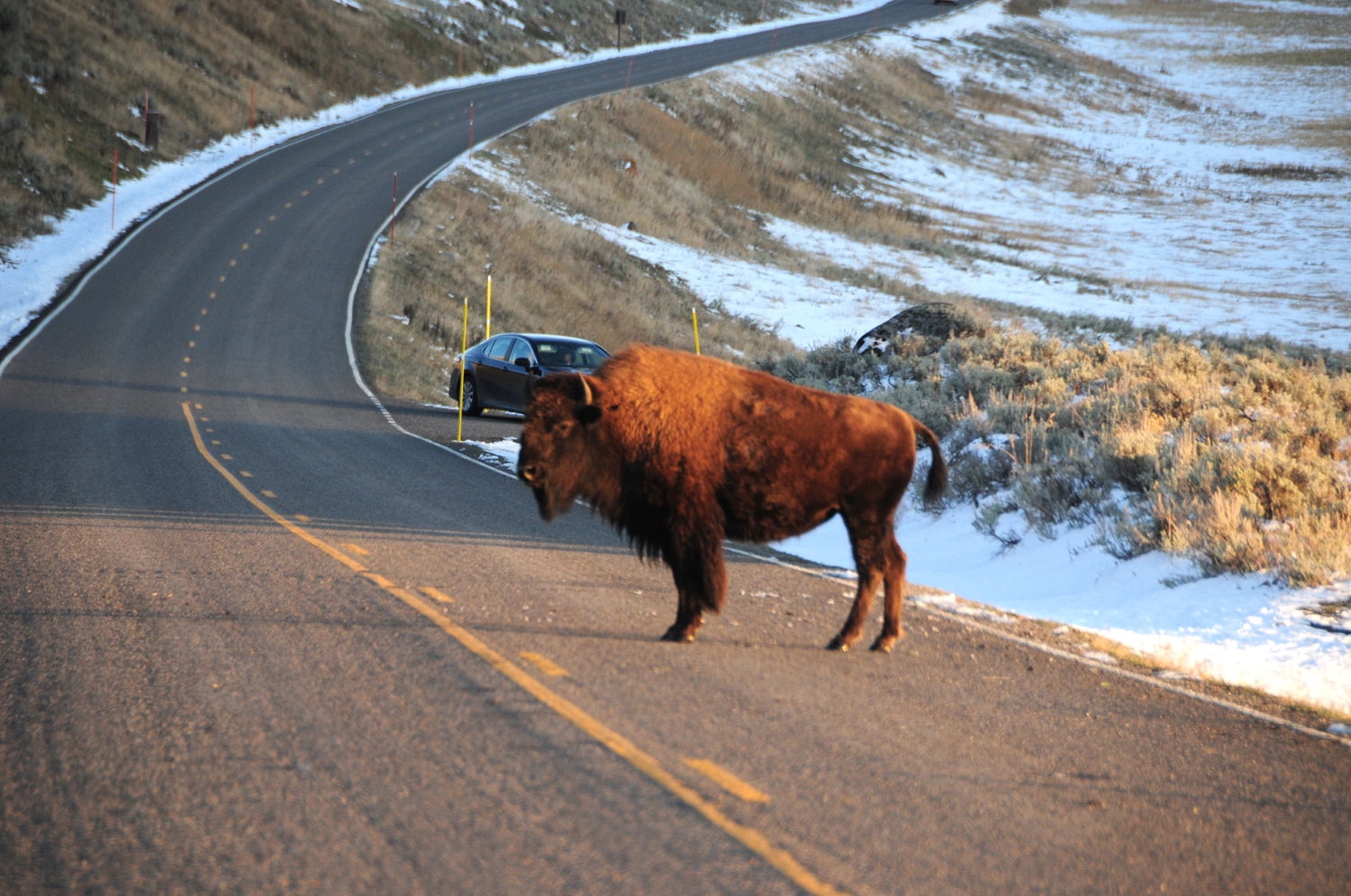 הביזונים ממש יוצרים כאן פקקי תנועה. לפעמים עדר שלם פשוט נתקע על הכביש…