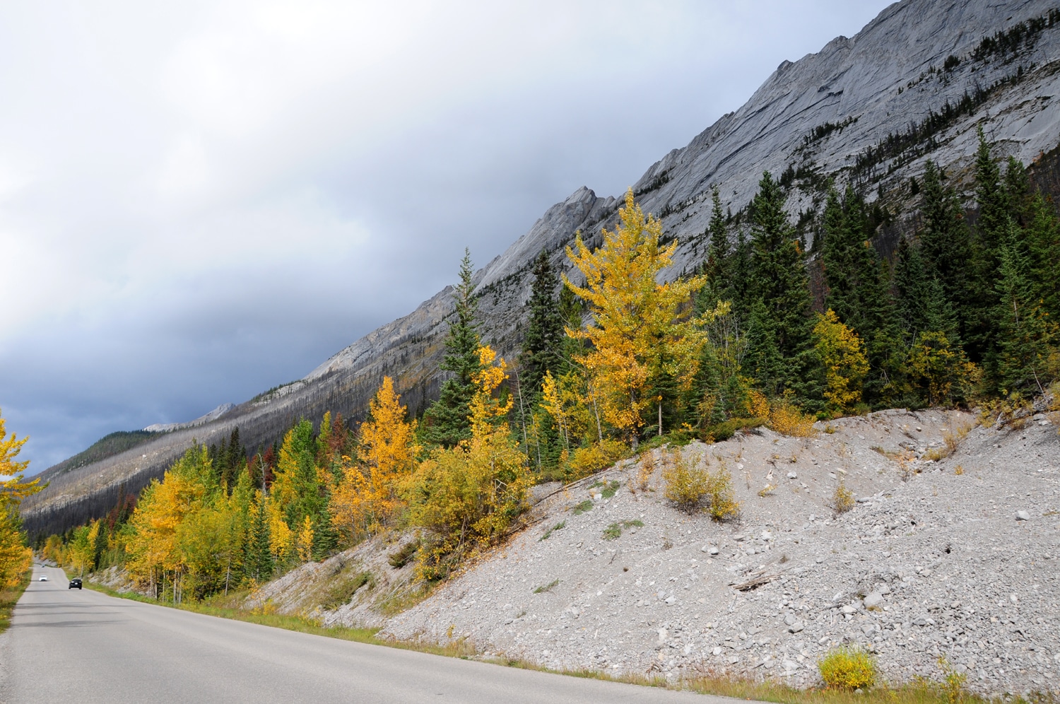 נחזור לכביש 11. הייתה לי הרגשה שהכביש הזה, המוביל מהרי הרוקי אל המישורים שממזרח להם, חייב להיות יפה, ואכן הכביש מרהיב ביופיו ומוקף במצוקים אדירים ששכבות הסלע בהן בהטיה של כמעט 90 מעלות. הנוף נשקף כאן לכל עבר, השלכת – מטריפה, והאזור כולו מחוץ התיירים השחוק והעמוס של שמורות הרי הרוקי (אין קרוואנים, וגם – יש יותר בעלי חיים. השלל שלנו – קויוט, עיט זהוב וכמה איילים).