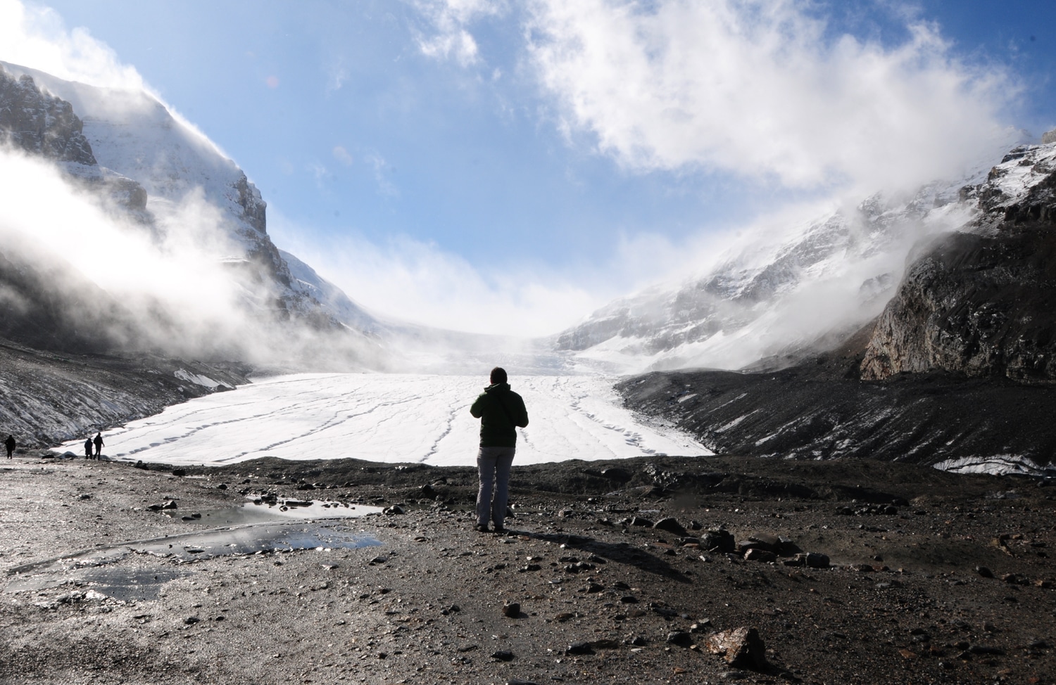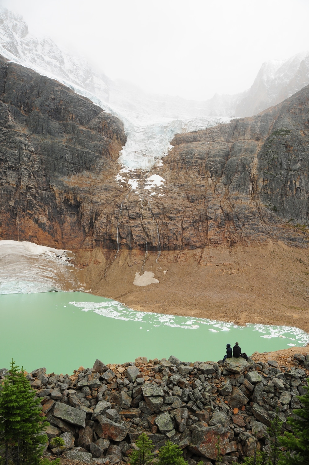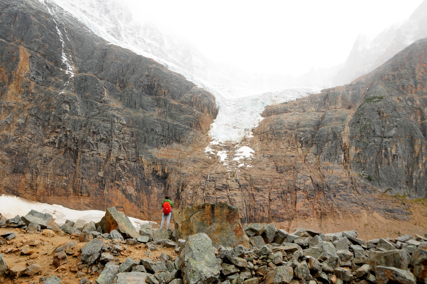 בהמשך הנסיעה דרומה היו אמנם מדי פעם התבהרויות אך הגשם התחזק ובשלב מסויים הפך לשלג כבד. בדרך כל אני דוגלת בטיולים ב'מה שיוצא אני מרוצה' אבל הפעם התבאסתי, פחות עבורי (כי לי כבר יצא לנסוע כמה פעמים בכביש הזה בראות טובה), ויותר עבור עומר (וגם עבור התמונות שידעתי שלא אצליח לצלם…). את מסלול ההליכה אל בסיס קרחון האת'בסקה (אחד משבעת הקרחונים המשתפלים משדה הקרח קולומביה הנסוג כיום בקצב של 5 מ' בשנה) התחלנו בסופת שלגים של ממש… אבל מזג האוויר ברוקיס משתנה מהר ולאחר כמה דקות של הליכה השלג הפסיק, השמים התבהרו ונוף הפסגות המושלגות נחשף מבעד לערפילים.