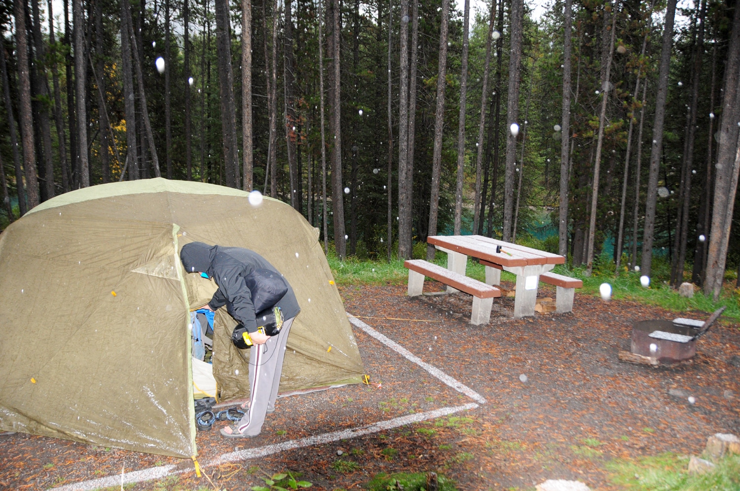 הלילה בקור המקפיא של 3-4 מעלות מתחת לאפס בחניון הלילה לשפת אגם טו ג'אק שבשבמורת באנף דווקא עבר בסדר. אבל בבוקר התחילה סופת שלגים שהקשתה על קיפול האוהל וגרמה לנו לעזוב את החניון בשעה מאוחרת מדי (10:30)…