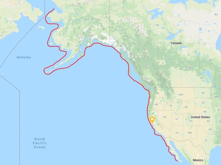 ראו כאן את מפת נדידת הלווייתנים האפורים לאורך חופי מערב צפון יבשת אמריקה מבחה קליפורניה בדרום ועד חופי אלסקה בצפון: