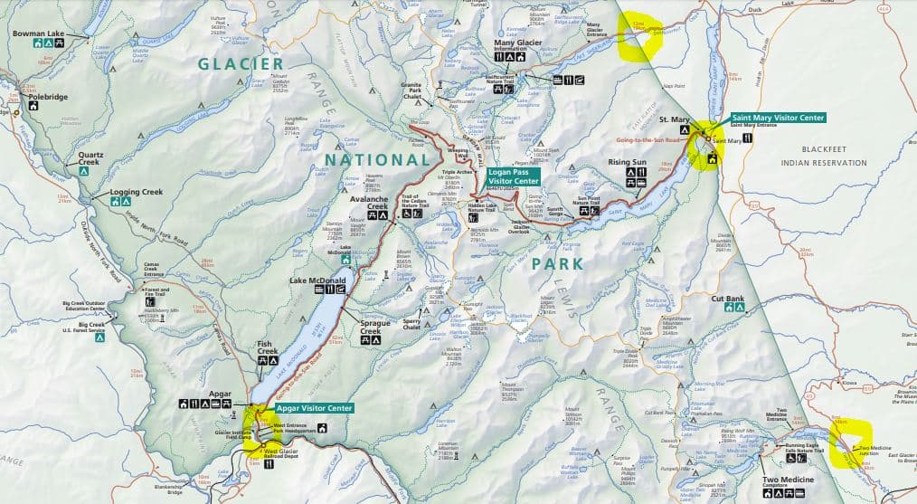 נקודת היישוב סיינט מרי, הסמוכה לכניסה המזרחית של השמורה היא המרכז הלוגיסטי של רוב המבקרים בשמורה (מלונות, מסעדות, תחנות דלק וכדומה). ערים גדולות הקרובות לשמורה הן מיזולה וגרייט פולס שבמרכז מדינת מונטנה. בשתי הערים יש שדה תעופה.