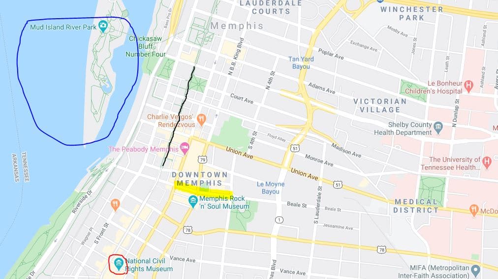 ראו מיקום האתרים במפה להלן (חצי האי מד איילנד מסומן בכחול, רחוב מיין בשחור, רחוב בייל בצהוב, מוזיאון זכויות האזרח באדום):