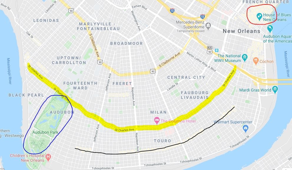- רחוב מגזין (Magazine St), בין הרחובות נפוליאון (Napoleon Ave) וסיינט אנדרו (Saint Andrew St), הוא אזור של בתי קפה, חנויות וגלריות (האזור הכי תוסס הוא סביב הצומת שלרחוב מגזין ורחוב הרמוני, Harmony St).ראו מפה של הכביש (מסומן צהוב. הצומת עם רחוב נפוליאון מסומן בכחול, עם רחוב סיינט אנדרו באדום ועם רחוב הרמוני בשחור):