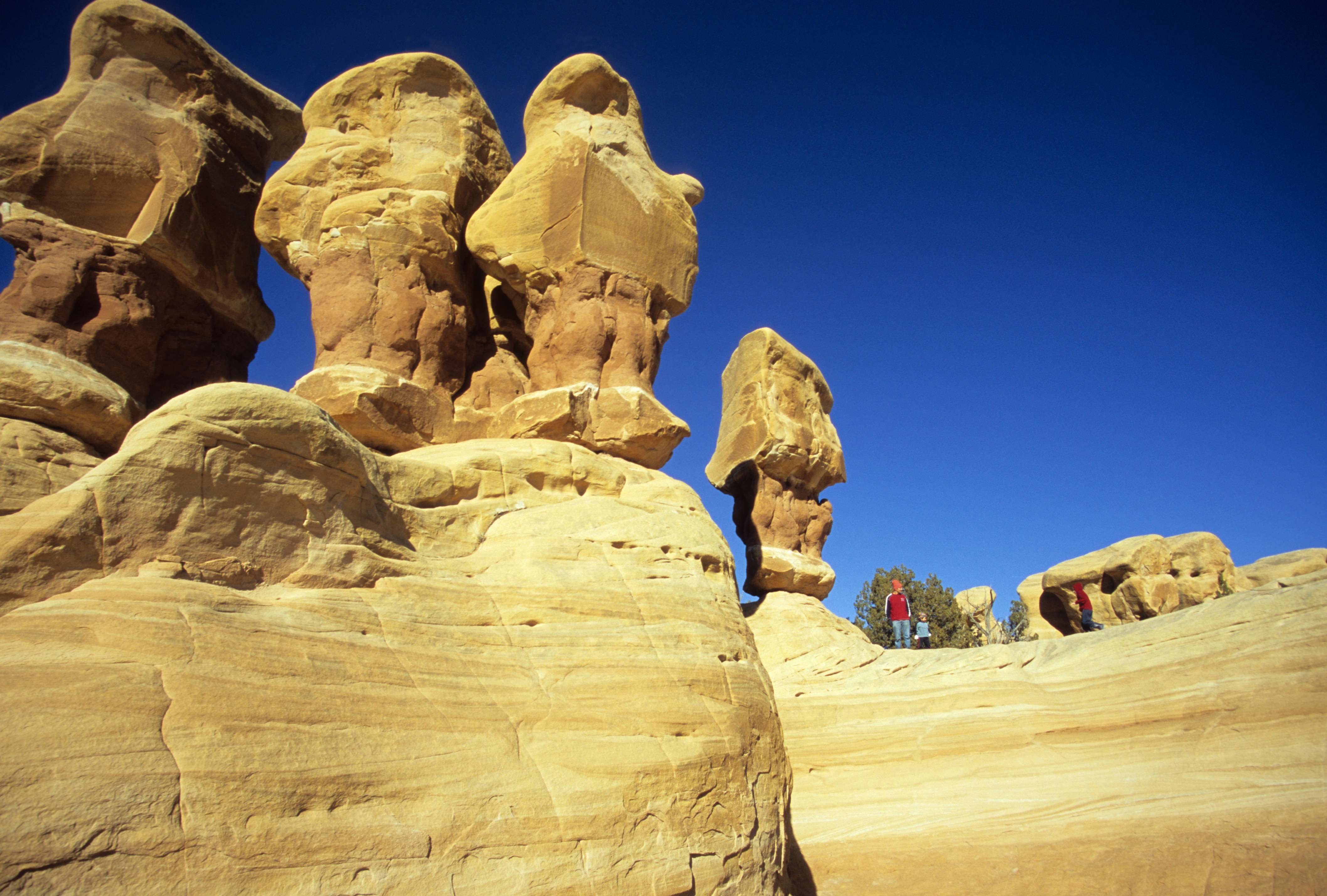 האנשים הקטנים (שימו לב לחולצה האדומה ולכובע הכתום) נותנים כאן ממד אחר לצריחי אבן החול. בלעדיהם התמונה הייתה ללא ספק פחות מוצלחת. גם התמונה הזו אגב צולמה בפילים והשקופית נסרקה. אפשר לראות כאן איכויות שאין עדיין בדיגיטלי. צולם במונומנט הלאומי גרנד סטירקייס אסקלנטה שבמדינת יוטה